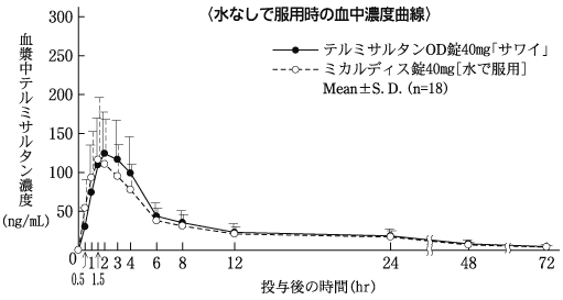 健康成人男子20例に、テルミサルタン40mg(カプセル剤)を単回経口投与したとき、空腹時投与に比べ食後投与でtmaxが遅延(空腹時:1.8±0.9時間、食後:5.3±1.4時間)し、Cmaxが57%、AUCが32%低下した14)。