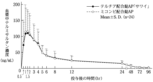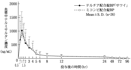 覚醒下の雄性高血圧自然発症ラット(SHR)を用いて、3mg/kgのテルミサルタン、10mg/kgのヒドロクロロチアジドあるいはその両者を5日間連続経口投与した場合の降圧作用を検討した。その結果、3mg/kgのテルミサルタン単独経口投与は投与5日目に36mmHgの最大降圧作用を示した。ヒドロクロロチアジドの単独投与では明らかな降圧作用は認められなかったが、テルミサルタンとの併用によりテルミサルタンの作用を明らかに増強し、最大降圧作用は53mmHgであった28)。