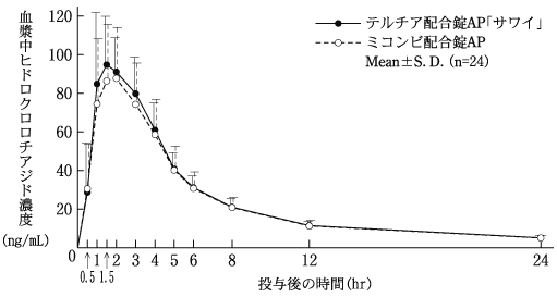 副作用の発現割合は、テルミサルタン40mg群で0.9%(1/109例)、テルミサルタン/ヒドロクロロチアジド40mg/12.5mg群では4.6%(5/109例)であった。テルミサルタン/ヒドロクロロチアジド40mg/12.5mg群の主な副作用は低血圧 1.8%(2/109例)であった23)。