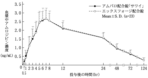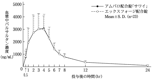 アムバロ配合錠「サワイ」とエックスフォージ配合錠を健康成人男子にそれぞれ1錠(バルサルタンとして80mg、アムロジピンとして5mg)空腹時単回経口投与(クロスオーバー法)し、バルサルタン及びアムロジピンの血漿中濃度を測定した。得られた薬物動態パラメータ(AUC、Cmax)について90%信頼区間法にて統計解析を行った結果、log(0.80)~log(1.25)の範囲内であり、両剤の生物学的同等性が確認された8)。