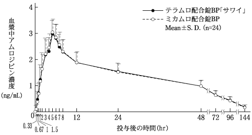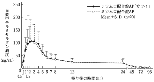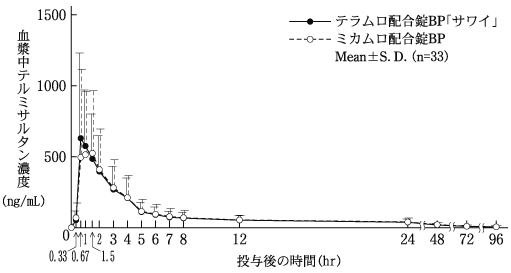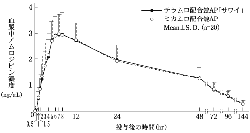 テルミサルタンあるいはアムロジピン単独あるいは併用による作用について、以下の報告がある。覚醒下の雄性高血圧自然発症ラット(SHR)を用いて、1mg/kgテルミサルタン及び5mg/kgアムロジピンを1日1回経口投与し、5日間経時的に血圧を測定したところ、1mg/kgテルミサルタン及び5mg/kgアムロジピンは、それぞれ単独投与により平均血圧が約25mmHg低下し、ほぼ同様の血圧低下作用を示した。次に、1mg/kgテルミサルタン、5mg/kgアムロジピン併用で1日1回5日間経口投与を行い、経時的に血圧を測定した。テルミサルタンとアムロジピンの併用投与による血圧に対する作用は、単独投与による血圧低下作用(約25mmHgの低下)に比べ、有意な血圧低下作用(約50mmHgの低下)がみられた35)。