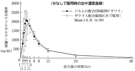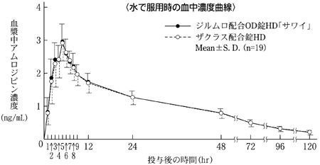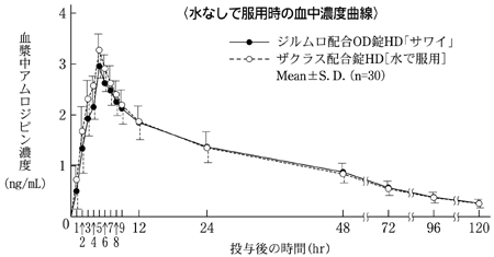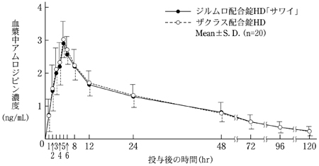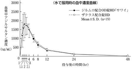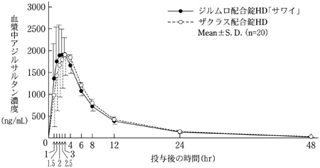 ジルムロ配合OD錠HD「サワイ」(水なし又は水で服用)とザクラス配合錠HD(水で服用)を健康成人男性にそれぞれ1錠(アジルサルタンとして20mg、アムロジピンとして5mg)空腹時単回経口投与(クロスオーバー法)し、アジルサルタン及びアムロジピンの血漿中濃度を測定した。得られた薬物動態パラメータ(AUC、Cmax)について90%信頼区間法にて統計解析を行った結果、log(0.80)~log(1.25)の範囲内であり、両剤の生物学的同等性が確認された9)。