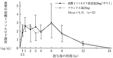 硝酸イソソルビド徐放錠20mg「サワイ」とフランドル錠20mgを健康成人男子にそれぞれ1錠(硝酸イソソルビドとして20mg)空腹時単回経口投与(クロスオーバー法)し、血漿中硝酸イソソルビド濃度を測定した。得られた薬物動態パラメータ(AUC、Cmax)について統計解析を行った結果、両剤の生物学的同等性が確認された3)。