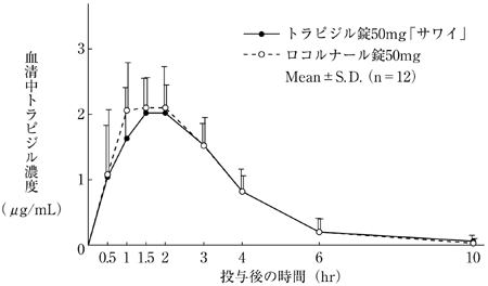 トラピジル錠50mg「サワイ」とロコルナール錠50mgを健康成人男子にそれぞれ2錠(トラピジルとして100mg)空腹時単回経口投与(クロスオーバー法)し、血清中トラピジル濃度を測定した。得られた薬物動態パラメータ(AUC、Cmax)について統計解析を行った結果、両剤の生物学的同等性が確認された3)。