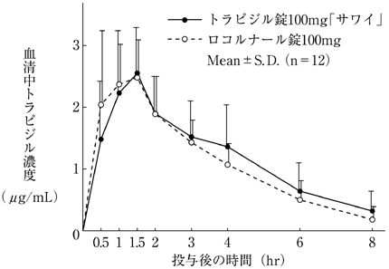 トラピジル錠100mg「サワイ」とロコルナール錠100mgを健康成人男子にそれぞれ1錠(トラピジルとして100mg)空腹時単回経口投与(クロスオーバー法)し、血清中トラピジル濃度を測定した。得られた薬物動態パラメータ(AUC、Cmax)について統計解析を行った結果、両剤の生物学的同等性が確認された4)。