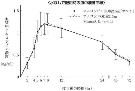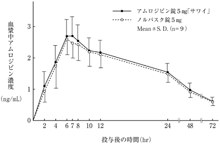 アムロジピン錠2.5mg「サワイ」とノルバスク錠2.5mgを健康成人男子にそれぞれ1錠(アムロジピンとして2.5mg)空腹時単回経口投与(クロスオーバー法)し、血漿中アムロジピン濃度を測定した。得られた薬物動態パラメータ(AUC、Cmax)について統計解析を行った結果、両剤の生物学的同等性が確認された8)。