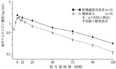 成人肝硬変患者(Child A、Bクラス)5例にアムロジピンとして2.5mgを単回経口投与した場合の薬物動態は図及び表のとおりであった。健康成人に比較して、投与72時間後の血中濃度が有意に上昇し、T1/2、AUCはやや高値を示したが有意差は認められなかった13)。
