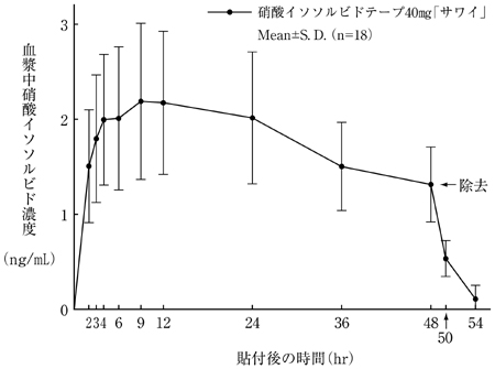 硝酸イソソルビドテープを用いた労作狭心症患者のエルゴメータ運動負荷試験では、貼付48時間後においても、投与前に比較して有意な運動耐容能の増加を示した5)。また、トレッドミル試験による運動耐容能も硝酸イソソルビドテープにより増加した。その増加の程度は貼付枚数に比例する傾向を示し、血漿中硝酸イソソルビド濃度と運動耐容能の間には正の用量反応関係が示された6)。
