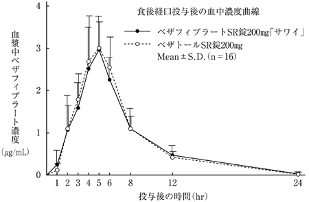 健康成人にベザフィブラート徐放錠200mgを単回経口投与した結果、最高血中濃度到達時間は4.5時間、最高血中濃度は3.5μg/mL、血中からの消失半減期は3時間、AUCは18μg・hr/mLであった1)。