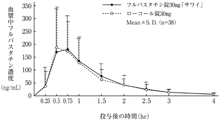フルバスタチン錠30mg「サワイ」とローコール錠30mgを健康成人男子にそれぞれ1錠(フルバスタチンとして30mg)空腹時単回経口投与(クロスオーバー法)し、血漿中フルバスタチン濃度を測定した。得られた薬物動態パラメータ(AUC、Cmax)について90%信頼区間法にて統計解析を行った結果、log(0.80)~log(1.25)の範囲内であり、両剤の生物学的同等性が確認された1)。