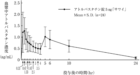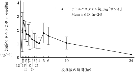 健康成人12例でアトルバスタチン10mgを絶食下及び食後に単回経口投与した結果、アトルバスタチンの吸収速度は食事により低下するものの、吸収率はほとんど影響を受けなかった6)。