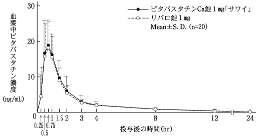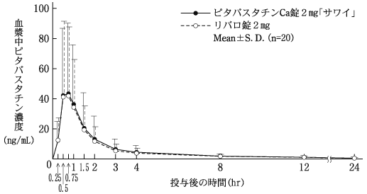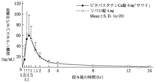 ピタバスタチンCa錠4mg「サワイ」とリバロ錠4mgを健康成人男子にそれぞれ1錠(ピタバスタチンカルシウムとして4mg)空腹時単回経口投与(クロスオーバー法)し、血漿中ピタバスタチン濃度を測定した。得られた薬物動態パラメータ(AUC、Cmax)について統計解析を行った結果、両剤の生物学的同等性が確認された3)。