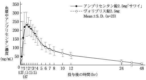 アンブリセンタン錠2.5mg「サワイ」とヴォリブリス錠2.5mgを健康成人男性にそれぞれ1錠(アンブリセンタンとして2.5mg)空腹時単回経口投与(クロスオーバー法)し、血漿中アンブリセンタン濃度を測定した。得られた薬物動態パラメータ(AUC、Cmax)について90%信頼区間法にて統計解析を行った結果、log(0.80)~log(1.25)の範囲内であり、両剤の生物学的同等性が確認された4)。