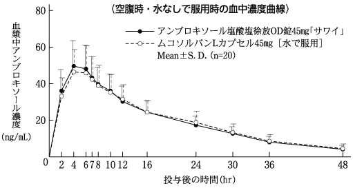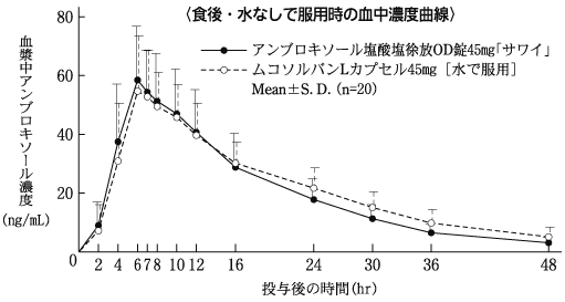 アンブロキソール塩酸塩徐放OD錠45mg「サワイ」(水なし又は水で服用)とムコソルバンLカプセル45mg(水で服用)を健康成人男子にそれぞれ1錠又は1カプセル(アンブロキソール塩酸塩として45mg)空腹時及び食後単回経口投与(クロスオーバー法)し、血漿中アンブロキソール濃度を測定した。得られた薬物動態パラメータ(AUC、Cmax)について統計解析を行った結果、両剤の生物学的同等性が確認された2)。