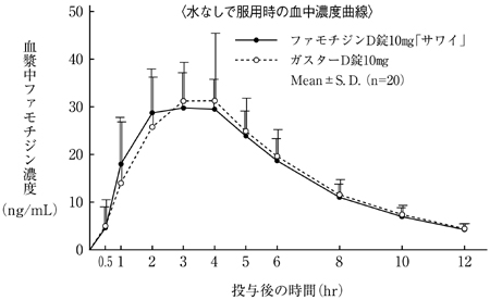 ファモチジンD錠10mg「サワイ」とガスターD錠10mgを健康成人男子にそれぞれ1錠(ファモチジンとして10mg)空腹時単回経口投与(クロスオーバー法)し、血漿中ファモチジン濃度を測定した。得られた薬物動態パラメータ(AUC、Cmax)について統計解析を行った結果、両剤の生物学的同等性が確認された4)。