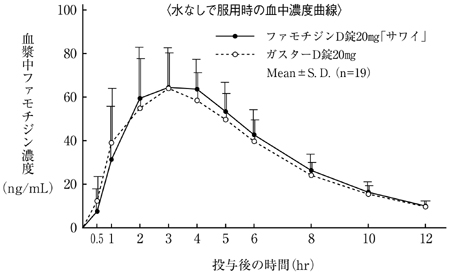 ファモチジンD錠20mg「サワイ」とガスターD錠20mgを健康成人男子にそれぞれ1錠(ファモチジンとして20mg)空腹時単回経口投与(クロスオーバー法)し、血漿中ファモチジン濃度を測定した。得られた薬物動態パラメータ(AUC、Cmax)について統計解析を行った結果、両剤の生物学的同等性が確認された5)。