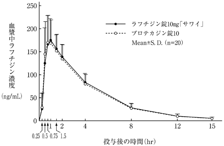ラフチジン錠10mg「サワイ」とプロテカジン錠10を健康成人男子にそれぞれ1錠(ラフチジンとして10mg)空腹時単回経口投与(クロスオーバー法)し、血漿中ラフチジン濃度を測定した。得られた薬物動態パラメータ(AUC、Cmax)について統計解析を行った結果、両剤の生物学的同等性が確認された2)。
