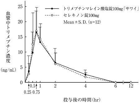 トリメブチンマレイン酸塩錠100mg「サワイ」とセレキノン錠100mgを健康成人男子にそれぞれ1錠(トリメブチンマレイン酸塩として100mg)空腹時単回経口投与(クロスオーバー法)し、血漿中トリメブチン濃度を測定した。得られた薬物動態パラメータ(AUC、Cmax)について統計解析を行った結果、両剤の生物学的同等性が確認された1)。
