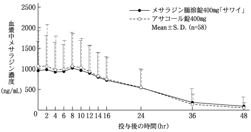 メサラジン腸溶錠400mg「サワイ」とアサコール錠400mgを健康成人男子に連続経口投与(クロスオーバー法)し、最終投与時より血漿中メサラジン濃度を測定した。(なお、連続経口投与については1回あたり3錠(メサラジンとして1,200mg)を1日3回、6日間行った。)得られた薬物動態パラメータ(AUC、Cmax)について統計解析を行った結果、AUCτは実数値の平均値の差の90%信頼区間が-0.20~+0.20の範囲内であり、また、AUCtおよびCmaxは対数値の平均値の差がlog(0.90)~log(1.11)の範囲内であり、かつ、溶出試験で溶出挙動が類似していることから、両剤の生物学的同等性が確認された17)。