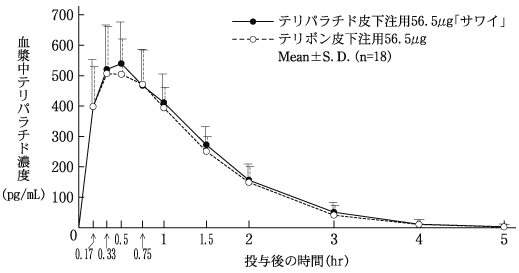 テリパラチド皮下注用56.5μg「サワイ」とテリボン皮下注用56.5μgを健康成人男性にそれぞれテリパラチドとして56.5μg絶食時単回皮下投与(クロスオーバー法)し、血漿中テリパラチド濃度を測定した。得られた薬物動態パラメータ(AUC、Cmax)について90%信頼区間法にて統計解析を行った結果、log(0.80)~log(1.25)の範囲内であり、両剤の生物学的同等性が確認された5)。