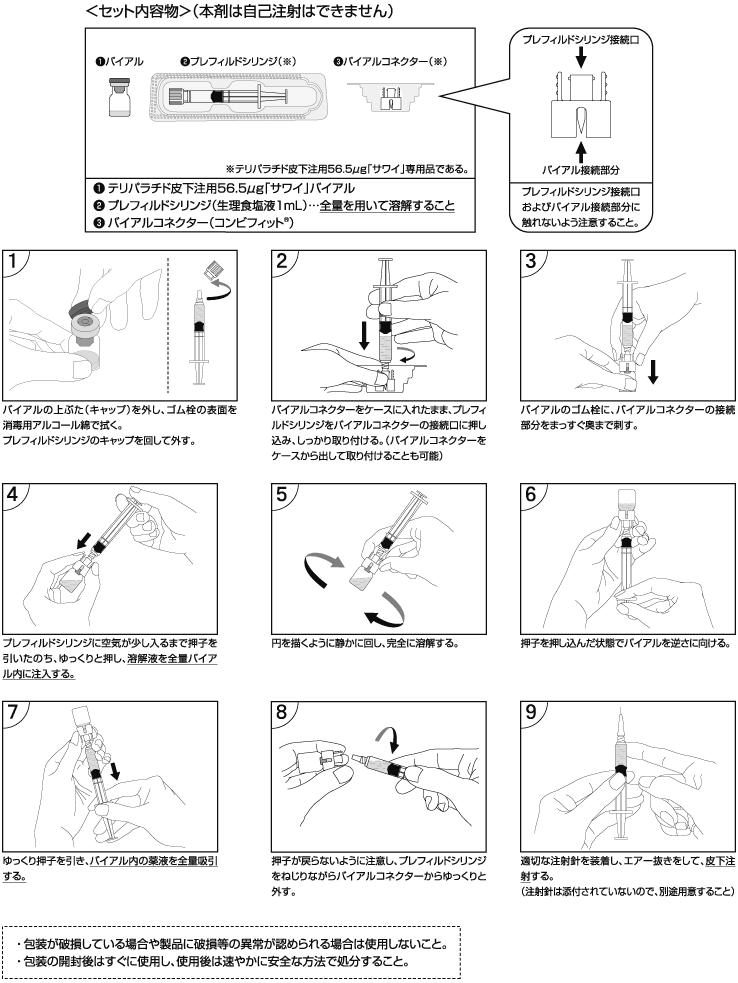 通常、成人には、テリパラチドとして56.5μgを1週間に1回皮下注射する。なお、本剤の投与は24ヵ月間までとすること。