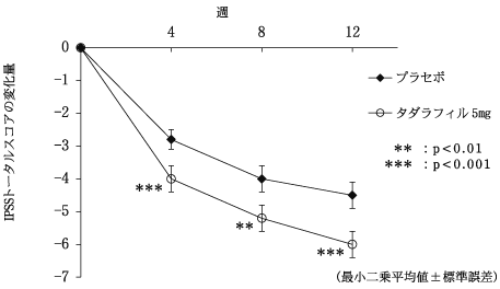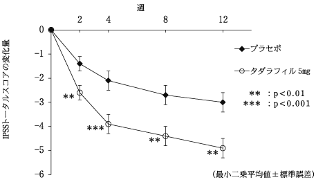 第Ⅱ相試験を完了した394例の被験者が42週の長期投与非盲検試験に参加した。前立腺肥大症に伴う排尿障害患者にタダラフィル5mgを1日1回54週間(二重盲検期間12週を含む)長期継続投与した結果、IPSSトータルスコアの継続的な改善の維持が認められ、長期の安全性及び良好な忍容性が確認された43),48)。副作用発現頻度は、タダラフィル5mg群で10.7%(42/394例)であった。主な副作用は、消化不良及び胃食道逆流性疾患が各1.3%(5/394例)であった。
