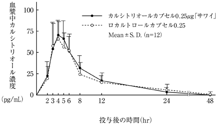 カルシトリオールカプセル0.25μg「サワイ」とロカルトロールカプセル0.25を健康成人男子にそれぞれ8カプセル(カルシトリオールとして2μg)空腹時単回経口投与(クロスオーバー法)し、血漿中カルシトリオール濃度を測定した。投与前値で補正した値より得られた薬物動態パラメータ(AUC、Cmax)について統計解析を行った結果、両剤の生物学的同等性が確認された4)。