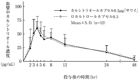 カルシトリオールカプセル0.5μg「サワイ」とロカルトロールカプセル0.5を健康成人男子にそれぞれ4カプセル(カルシトリオールとして2μg)空腹時単回経口投与(クロスオーバー法)し、血漿中カルシトリオール濃度を測定した。投与前値で補正した値より得られた薬物動態パラメータ(AUC、Cmax)について統計解析を行った結果、両剤の生物学的同等性が確認された5)。