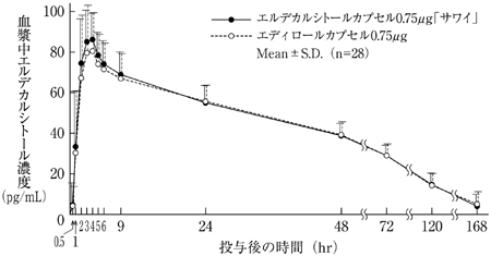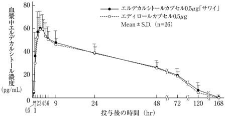 エルデカルシトールカプセル0.5μg「サワイ」とエディロールカプセル0.5μgを健康成人男子にそれぞれ1カプセル(エルデカルシトールとして0.5μg)空腹時単回経口投与(クロスオーバー法)し、血漿中エルデカルシトール濃度を測定した。得られた薬物動態パラメータ(AUC、Cmax)について90%信頼区間法にて統計解析を行った結果、log(0.80)~log(1.25)の範囲内であり、両剤の生物学的同等性が確認された5)。