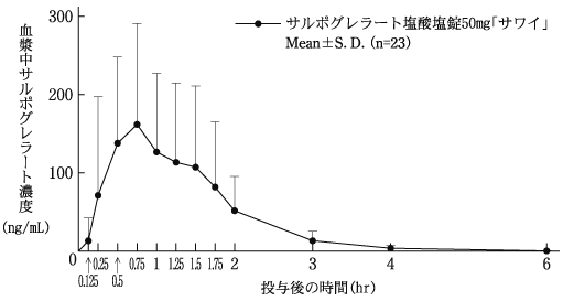 サルポグレラート塩酸塩錠50mg「サワイ」を健康成人男子に1錠(サルポグレラート塩酸塩として50mg)空腹時単回経口投与したときの薬物動態は以下のとおりであった1)。(「経口固形製剤の処方変更の生物学的同等性試験ガイドライン」に従い、ヒトを対象とした生物学的同等性試験によりアンプラーグ錠50mgとの同等性が確認された旧処方製剤と、現処方製剤について実施した生物学的同等性試験におけるデータ)