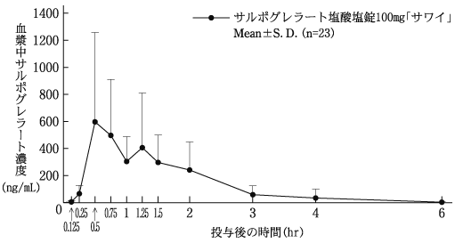サルポグレラート塩酸塩錠100mg「サワイ」を健康成人男子に1錠(サルポグレラート塩酸塩として100mg)空腹時単回経口投与したときの薬物動態は以下のとおりであった2)。(「経口固形製剤の処方変更の生物学的同等性試験ガイドライン」に従い、ヒトを対象とした生物学的同等性試験によりアンプラーグ錠100mgとの同等性が確認された旧処方製剤と、現処方製剤について実施した生物学的同等性試験におけるデータ)