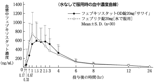 健康成人男性6例に、フェブキソスタットとして40mgを朝食後に1日1回7日間反復経口投与したとき、血漿中フェブキソスタット濃度は投与開始後3日で定常状態に達し、反復投与による蓄積性は認められなかった6)。