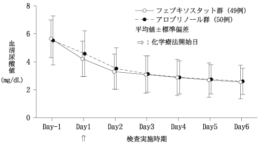 化学療法施行予定の悪性腫瘍患者99例を対象にアロプリノール対照非盲検無作為化比較試験を行った。フェブキソスタット60mg/日又はアロプリノールは300mg/日[腎機能障害のある患者(30≦eGFR<45mL/min/1.73m2)では200mg/日]を化学療法施行開始24時間前から6日間投与した。投与開始6日後までの血清尿酸値AUC(主要評価項目)は、アロプリノール群に対するフェブキソスタット群の非劣性が示された(非劣性マージンは150mg・h/dL)。また、フェブキソスタット60mg/日の投与により血清尿酸値は投与開始6日後まで経時的に減少した31),32)。本試験におけるフェブキソスタット60mg/日の安全性評価対象49例中1例(2.0%)に副作用が認められた。その副作用は、AST増加、ALT増加であった。