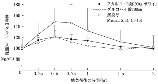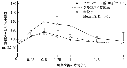 アカルボース錠50mg「サワイ」とグルコバイ錠50mgを健康成人男子にそれぞれ2錠(アカルボースとして100mg)空腹時単回経口投与(クロスオーバー法)した。無投与時及び投与直後にショ糖負荷(75g)し経時的に血漿中グルコース濃度を測定したところ、両剤は無投与時と比較して有意な血糖上昇抑制作用を示した。また、得られたパラメータ(AUC、Cmax)について統計解析を行った結果、両剤の生物学的同等性が確認された16)。[AUC:血漿中グルコース濃度-時間曲線下面積、Cmax:最高血漿中グルコース濃度]