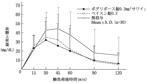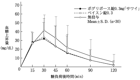 ボグリボース錠0.3mg「サワイ」とベイスン錠0.3を健康成人男子にそれぞれ2錠(ボグリボースとして0.6mg)注)空腹時単回経口投与し、無投与群を含む3群(クロスオーバー法)に対し、ショ糖負荷(50%溶液、200mL)における血糖値の上昇量を経時的に測定した。得られたパラメータ(AUC、Cmax)について統計解析を行った結果、両剤の生物学的同等性が確認された32)。[AUC:血糖上昇量-時間曲線下面積、Cmax:最高血糖上昇量]