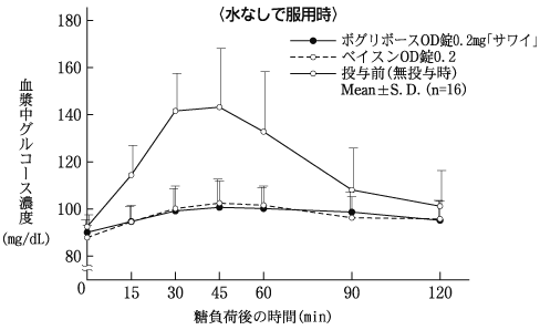 ボグリボースOD錠0.2mg「サワイ」とベイスンOD錠0.2を健康成人男子にそれぞれ1錠(ボグリボースとして0.2mg)を1日3回毎食直前にのべ4日間(9回)連続経口投与(クロスオーバー法)した。投与前及び最終投与直後にショ糖負荷(50%溶液、200mL)し経時的に血漿中グルコース濃度を測定した。得られたパラメータ(⊿AUC、⊿Cmax)について統計解析を行った結果、両剤の生物学的同等性が確認された31)。