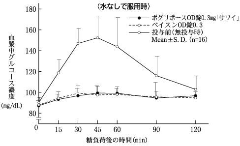 ボグリボースOD錠0.3mg「サワイ」とベイスンOD錠0.3を健康成人男子にそれぞれ1錠(ボグリボースとして0.3mg)を1日3回毎食直前にのべ4日間(9回)連続経口投与(クロスオーバー法)した。投与前及び最終投与直後にショ糖負荷(50%溶液、200mL)し経時的に血漿中グルコース濃度を測定した。得られたパラメータ(⊿AUC、⊿Cmax)について統計解析を行った結果、両剤の生物学的同等性が確認された31)。