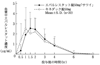 エパルレスタット錠50mg「サワイ」とキネダック錠50mgを健康成人男子にそれぞれ1錠(エパルレスタットとして50mg)空腹時単回経口投与(クロスオーバー法)し、血漿中エパルレスタット濃度を測定した。得られた薬物動態パラメータ(AUC、Cmax)について統計解析を行った結果、両剤の生物学的同等性が確認された3)。