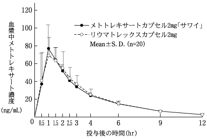 健康成人男子(20例)にメトトレキサートカプセル2mg「サワイ」とリウマトレックスカプセル2mgをそれぞれ1カプセル(メトトレキサートとして2mg)空腹時単回経口投与(クロスオーバー法)したときの血漿中メトトレキサート濃度推移は以下のとおりであり、得られた薬物動態パラメータ(AUC、Cmax)について90%信頼区間法にて統計解析を行った結果、両剤の生物学的同等性が確認された4)。