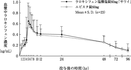 ラロキシフェン塩酸塩錠60mg「サワイ」とエビスタ錠60mgを閉経後健康女性にそれぞれ1錠(ラロキシフェン塩酸塩として60mg)空腹時単回経口投与(クロスオーバー法)し、血漿中ラロキシフェン濃度を測定した。得られた薬物動態パラメータ(AUC、Cmax)について統計解析を行った結果、AUCは対数値の平均値の差の90%信頼区間がlog(0.80)~log(1.25)の範囲内であり、また、Cmaxは対数値の平均値の差がlog(0.90)~log(1.11)の範囲内であり、かつ、溶出試験で溶出挙動が類似していることから、両剤の生物学的同等性が確認された5)。
