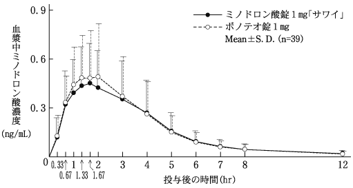 ミノドロン酸錠1mg「サワイ」とボノテオ錠1mgを閉経後健康女性にそれぞれ1錠(ミノドロン酸水和物として1mg)空腹時単回経口投与(クロスオーバー法)し、血漿中ミノドロン酸濃度を測定した。得られた薬物動態パラメータ(AUC、Cmax)について90%信頼区間法にて統計解析を行った結果、log(0.80)~log(1.25)の範囲内であり、両剤の生物学的同等性が確認された4)。