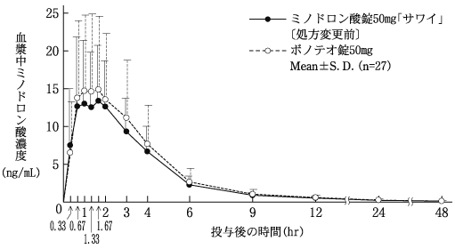 処方変更後製剤と処方変更前製剤を閉経後健康女性にそれぞれ1錠(ミノドロン酸水和物として50mg)空腹時単回経口投与(クロスオーバー法)し、血漿中ミノドロン酸濃度を測定した。得られた薬物動態パラメータ(AUC、Cmax)について90%信頼区間法にて統計解析を行った結果、log(0.80)~log(1.25)の範囲内であり、両剤の生物学的同等性が確認された5)。