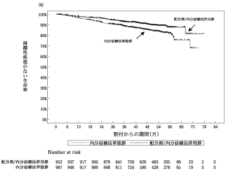注1)再発高リスクとして、以下の①又は②の患者と定義された。①腋窩リンパ節転移が陽性の患者(術前又は術後薬物療法を実施している患者では、薬物療法実施前に腋窩リンパ節転移が陽性の患者)。②腋窩リンパ節転移が陰性で下記の1)~3)のいずれかに該当する患者。1)術前薬物療法歴がない場合:手術検体において(ⅰ)浸潤径3cm以上、(ⅱ)組織学的グレード(HG)3、(ⅲ)明らかな脈管侵襲が認められる、(ⅳ)HG2かつ浸潤径2cm以上3cm未満、(ⅴ)HG2、浸潤径2cm未満かつ増殖マーカー高値※、又は(ⅵ)HG1、浸潤径2cm以上3cm未満かつ増殖マーカー高値※。2)術前化学療法歴がある場合:原発巣又は腋窩リンパ節の手術検体において浸潤癌の残存が認められる。3)術前内分泌療法歴がある場合:手術検体において(ⅰ)浸潤径3cm以上、(ⅱ)HG3、(ⅲ)明らかな脈管侵襲が認められる、(ⅳ)HG2かつ浸潤径2cm以上3cm未満、(ⅴ)HG2、浸潤径2cm未満かつ増殖マーカー高値※又は(ⅵ)HG1、浸潤径2cm以上3cm未満かつ増殖マーカー高値※。※:中央病理判定によるKi-67 labeling index 30%以上、又はKi-67 labeling index 14%以上 30%未満の場合はOncotype DX の測定が実施され、recurrence score(RS)18以上の場合に適格とされた。注2)術後放射線療法が行われている場合には、登録の2週間以上前に終了していることとされ、配合剤と放射線療法との同時併用及び配合剤投与終了後の放射線療法は行わないこととされた。注3)以下のいずれかから選択された。なお、術前内分泌療法歴がある場合には、術前と術後内分泌療法の投与期間として合計5年間投与することとされた。・閉経前の場合:タモキシフェン又はトレミフェン。ゴセレリン又はリュープロレリン2年間との併用も可とされた。・閉経後の場合:アナストロゾール、レトロゾール又はエキセメスタン。アロマターゼ阻害剤が不適格の場合には、タモキシフェン又はトレミフェンも可とされた。注4)有効性の解析対象の症例数は配合剤と内分泌療法の併用群で952例、内分泌療法単独群で967例であった。