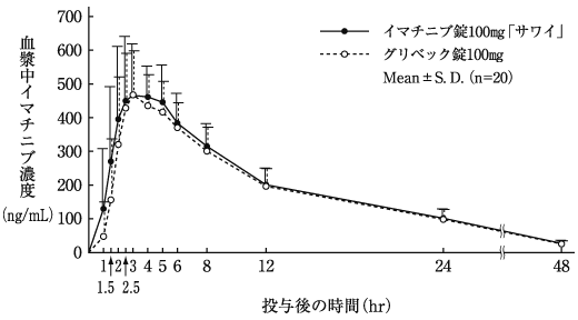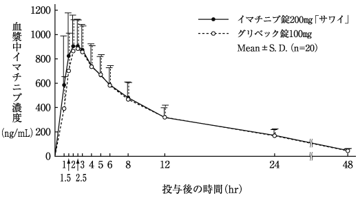 イマチニブ錠100㎎「サワイ」とグリベック錠100mgを健康成人男子にそれぞれ1錠(イマチニブとして100㎎)食後単回経口投与(クロスオーバー法)し、血漿中イマチニブ濃度を測定した。得られた薬物動態パラメータ(AUC、Cmax)について90%信頼区間法にて統計解析を行った結果、log(0.80)~log(1.25)の範囲内であり、両剤の生物学的同等性が確認された5)。