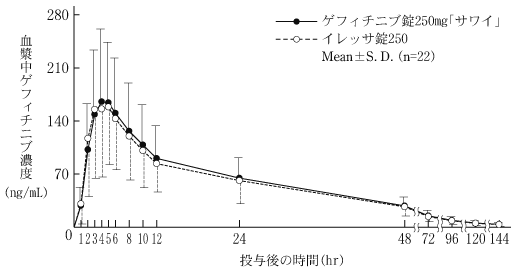 ゲフィチニブ錠250mg「サワイ」とイレッサ錠250を健康成人男子にそれぞれ1錠(ゲフィチニブとして250mg)空腹時単回経口投与(クロスオーバー法)し、血漿中ゲフィチニブ濃度を測定した。得られた薬物動態パラメータ(AUC、Cmax)について90%信頼区間法にて統計解析を行った結果、log(0.80)~log(1.25)の範囲内であり、両剤の生物学的同等性が確認された12)。