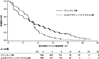 日本を含むアジアで実施した無作為化非盲検並行群間比較試験24)では、軽度の喫煙歴を有する又は非喫煙であり、かつ組織型が腺癌である、化学療法未治療の進行・再発非小細胞肺癌患者1217例(うち日本人233例)を対象に、ゲフィチニブ(250mg/日)と、カルボプラチンとパクリタキセルの併用化学療法が比較された。主要評価項目である無増悪生存期間及び副次評価項目である全生存期間の結果は下表及び下図の通りである。なお、本試験は無増悪生存期間における非劣性検証を主要目的として実施された。