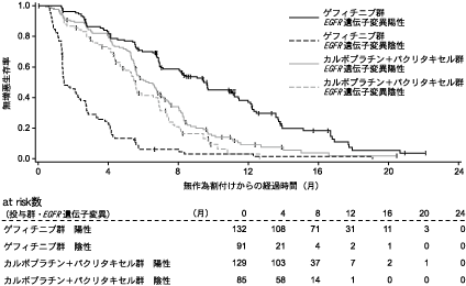 また、EGFR遺伝子変異(Exon18~21の変異が検討された)の有無による部分集団解析の結果は、下表及び下図の通りである。