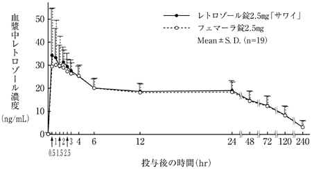 レトロゾール錠2.5mg「サワイ」とフェマーラ錠2.5mgを閉経後健康女性にそれぞれ1錠(レトロゾールとして2.5mg)空腹時単回経口投与(クロスオーバー法)し、血漿中レトロゾール濃度を測定した。得られた薬物動態パラメータ(AUC、Cmax)について90%信頼区間法にて統計解析を行った結果、log(0.80)~log(1.25)の範囲内であり、両剤の生物学的同等性が確認された6)。
