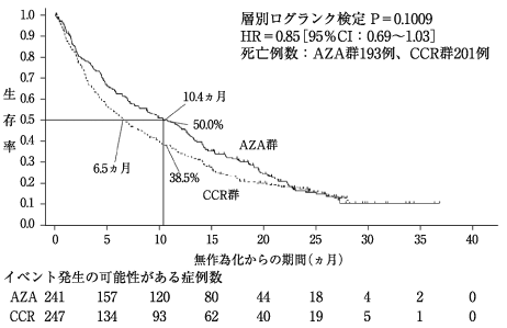 主要評価項目である生存期間(中央値)は、CCR群15.02ヵ月に対し、AZA群24.46ヵ月であり9.44ヵ月の差が認められた(層別ログランク検定、p=0.0001)14)。