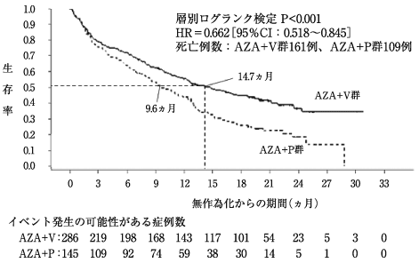強力な寛解導入療法の適応とならない未治療のAML患者に対し、ベネトクラクスとの併用(AZA+V群)又はプラセボとの併用(AZA+P群)で、本剤75mg/m2を1日1回7日間(28日毎)皮下投与又は静脈内投与した。ベネトクラクス及びプラセボは、第1、2及び3日目にそれぞれベネトクラクス100、200及び400mg又はプラセボを1日1回食後に経口投与した後、ベネトクラクス400mg又はプラセボを1日1回継続投与した。433例(日本人患者37例を含む)がAZA+V群287例、AZA+P群146例に割り付けられた。主要評価項目である全生存期間(中央値)は、AZA+P群9.6ヵ月(95%信頼区間:7.4~12.7ヵ月)に対し、AZA+V群14.7ヵ月(95%信頼区間:11.9~18.7ヵ月)であり(ハザード比:0.662、層別ログランク検定、p<0.001)、AZA+V群はAZA+P群に対して統計学的に有意な延長を認めた16),注19)。もう1つの主要評価項目である治験責任医師判定の複合的完全寛解(完全寛解[CR]+血球数回復が不完全な完全寛解[CRi])率は、AZA+P群25.3%(20/79例、95%信頼区間:16.2~36.4%)に対し、AZA+V群で65.3%(96/147例、95%信頼区間:57.0~73.0%)であり(Cochran-Mantel-Haenszel検定、p<0.001)、AZA+V群はAZA+P群に対して統計学的に有意に高値であった注20)。